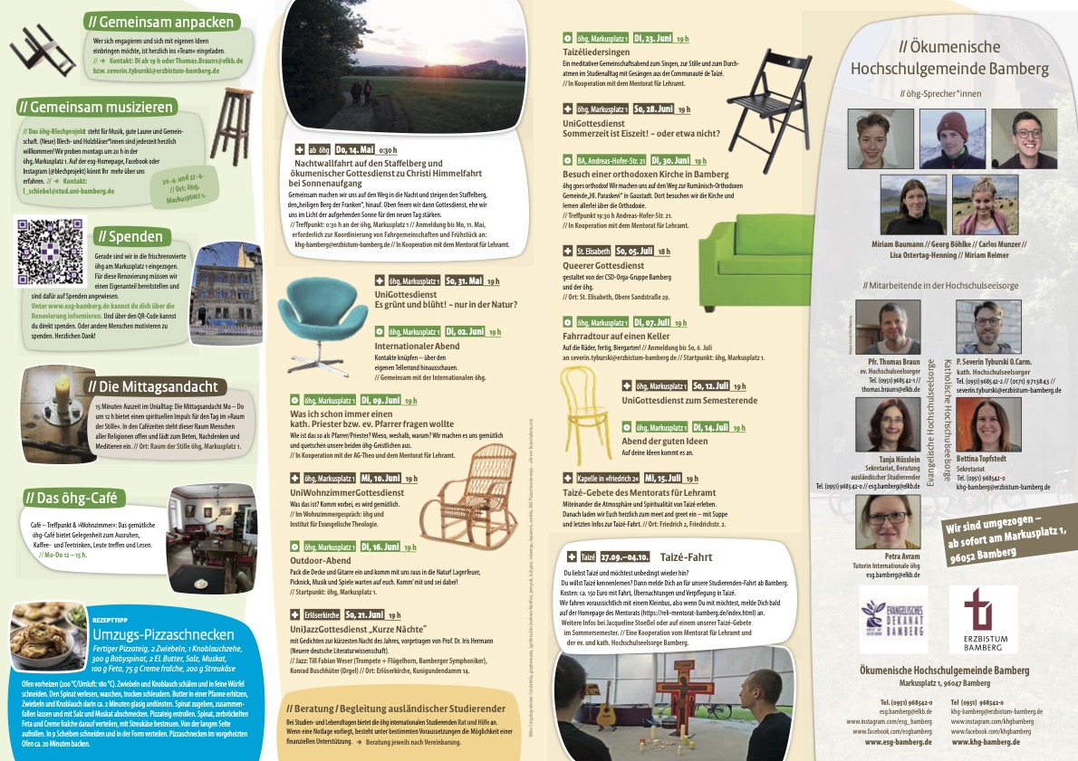 Am vergangen Dienstag, 22. Juli, haben wir als Sprecher*innenkreis das neue Logo der „öhg-Bamberg“ enthüllt! D.h. ab jetzt treten wir gemeinsam als eine ökumenische Hochschulgemeinde auf. Das ist wunderbar und war ein großes Fest!
